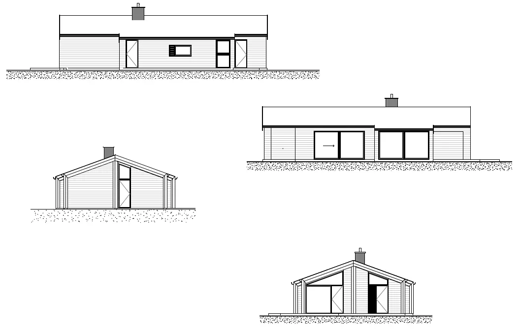 Moderne stram arkitektur uden udhæng kendetegner Henne Serien. Udstillingshuset er et længehus på 105 m2 med fantastisk store vinduespartier og skydedør i køkken / alrum.